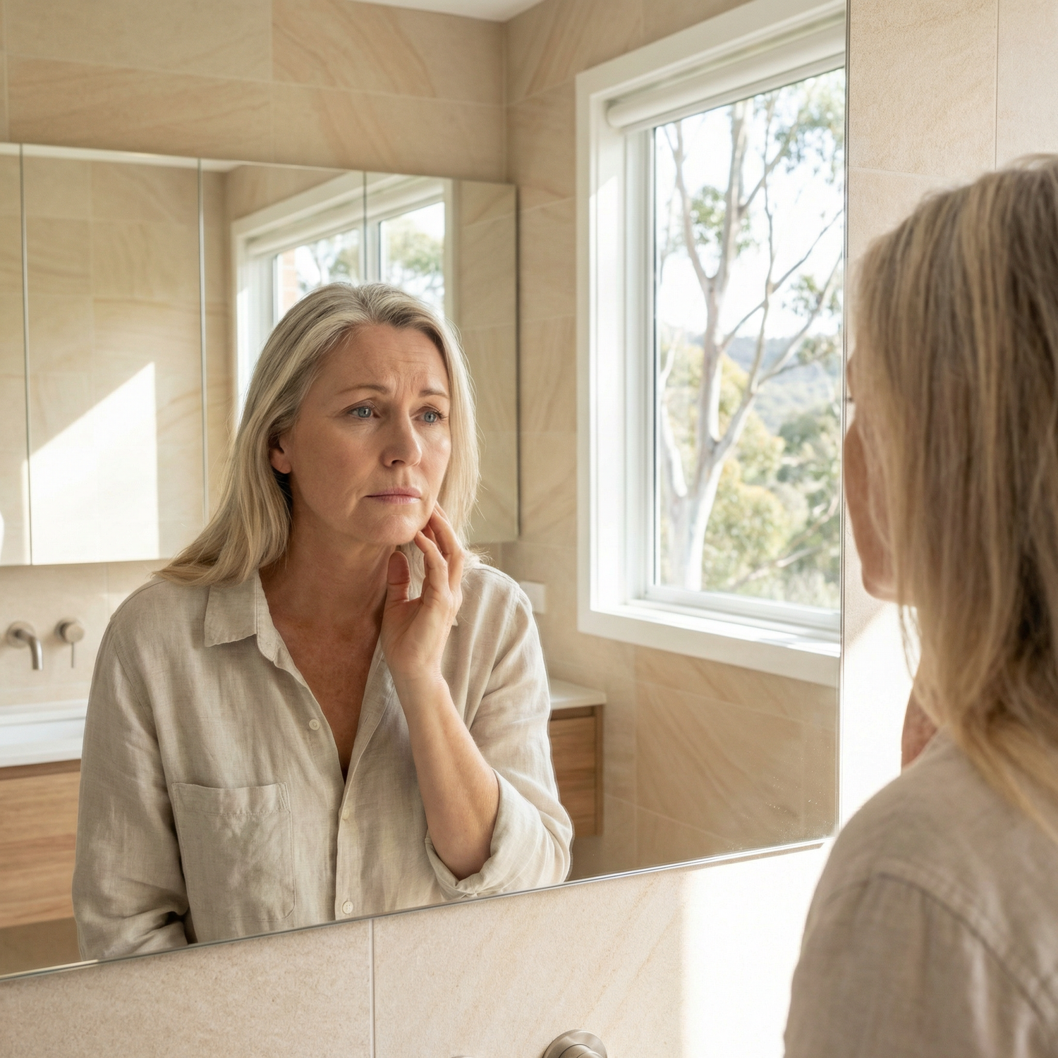 Maybe it’s the overhead LEDs in a public restroom, or the unforgiving glare of a Zoom call where you catch a glimpse of your own thumbnail video. You see a woman you don’t quite recognize.